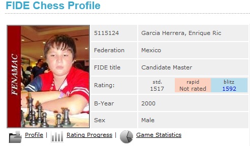 Con beneplácito les informo que ya aparece oficialmente en la página de la Federación Internacional de Ajedrez el título de cm obtenido por Enrique García en el North American Youth Chess Championship, asimismo me parece que es el primer Neoleonés en la lista de rating Blitz de la FIDE.