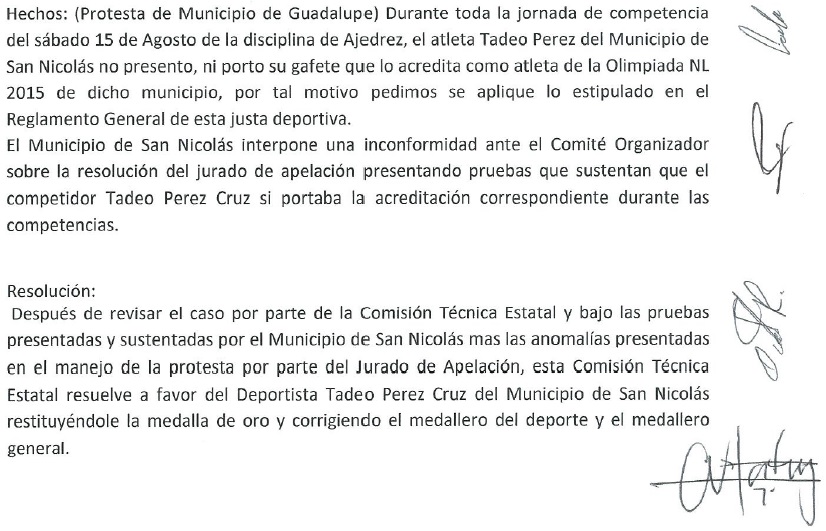 Modificaciones al medallero después de que la Comisión Técnica Estatal resolviera devolver el metal áureo al atleta Tadeo Pérez Cruz quien bajo circustancias irregulares (Palabras de la Comisión Técnica Estatal de INDE) fuera despojado de dicha medalla.