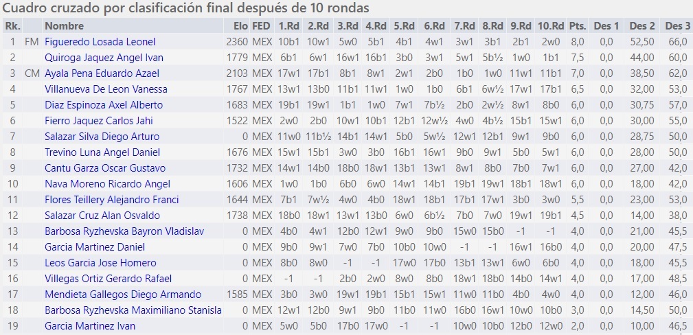 Se disputaron 5 rondas en sistema suizo a dos partidas con un ritmo de juego blitz, 3 minutos por jugador con 2 segundos de incremento por jugada y a pesar de que el MF Leonel Figueredo marchaba como claro favorito, no le fue fácil contener el fuerte impulso de los más jóvenes competidores, que vienen pisando fuerte y empató un par de matches, contra Axel Díaz e Iván Quiroga, quienes poco a poco se van consolidando como el futuro del ajedrez en Nuevo León.