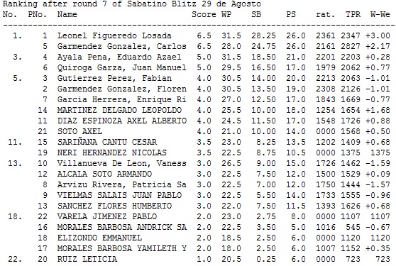 En esta ocasión se retomó la modalidad Blitz 3+2 del Sabatino en la cual el Maestro FIDE Leonel Figueredo Losada se impuso por mejor coeficiente de desempate al MF Carlos Garméndez González, situándose ambos con 6.5 puntos sobre 7 partidas a punto y medio de sus más cercanos perseguidores, el CM Azael Ayala Peña y Juan Manuel Quiroga Garza.