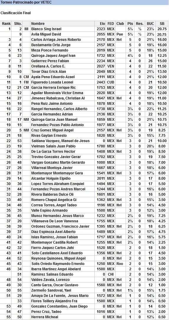 Las 6 rondas que comprendió el torneo fueron vertiginosas, desde la ronda 1 se sabía quienes eran los favoritos hasta que el contingente se cerró entre los fuertes jugadores locales: el CMy MN Azael Ayala y Jesús Carlos, los cubanos afincados en Nuevo León desde hace muchos años: el MF Leonel Figueredo y Fabián Gutiérrez y los visitantes de la Ciudad de México: el MI Israel Blanco y David Ávila, un fuerte cierre de estos últimos los llevó a la ronda 6 con 5 puntos y tras un acuerdo de tablas compartieron el primer lugar haciéndose con los premios en metálico de $3,000 y $2,000 con pases dobles para el Abierto GNP Seguros los días sábado y domingo, en tercera posición se colocó el local Jesús Carlos haciéndose acreedor al premio de $1,000 y 2 pases el día viernes.