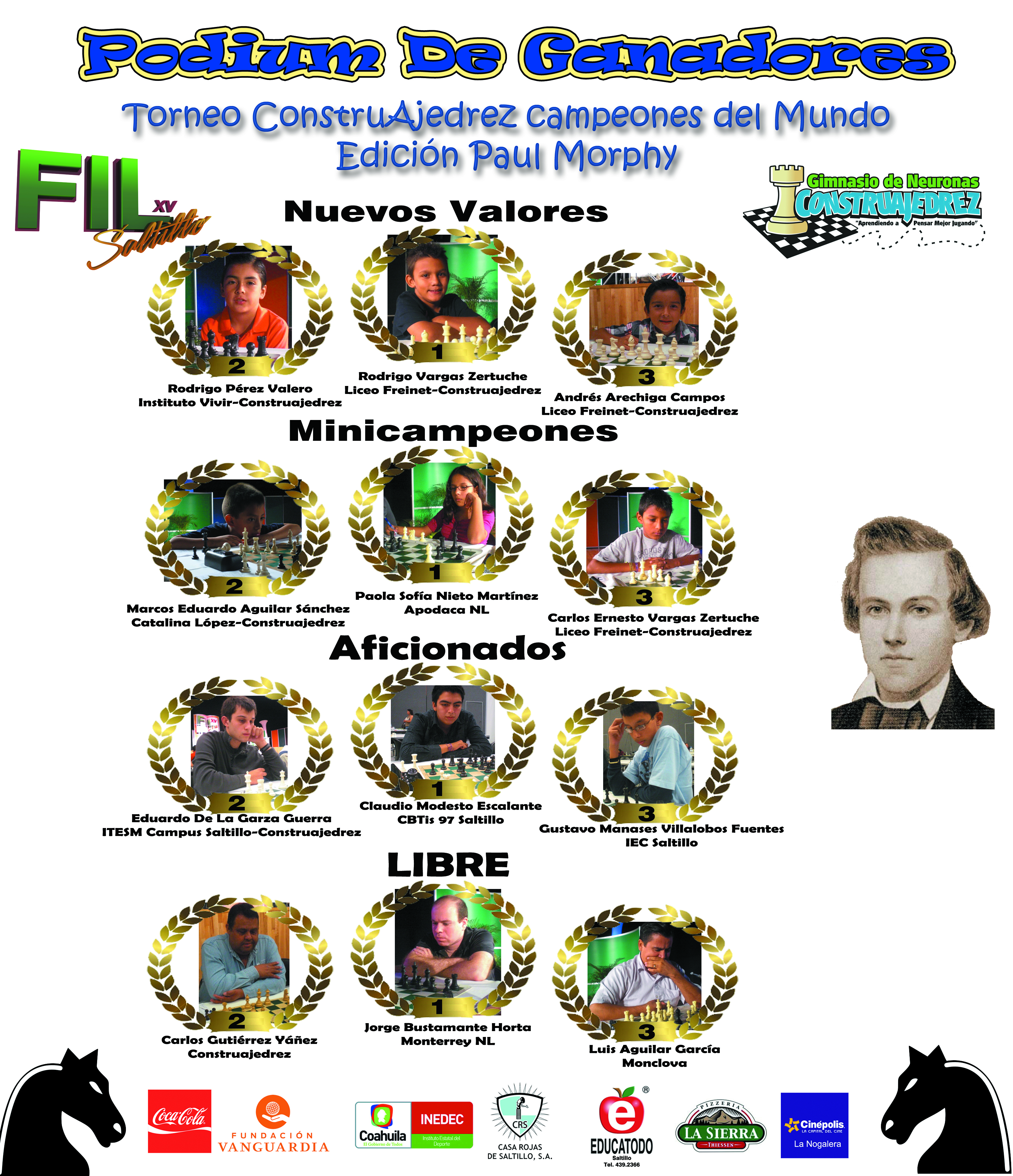 Adjuntamos podium de ganadores del Torneo Construajedrez Campeones del Mundo Edición Paul Morphy, agradecemos puedas publicarlo en tu distinguido portal.