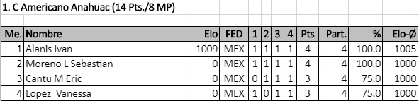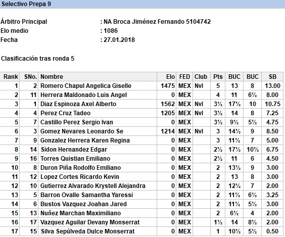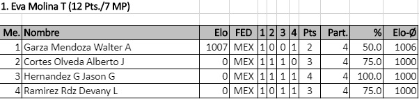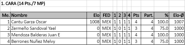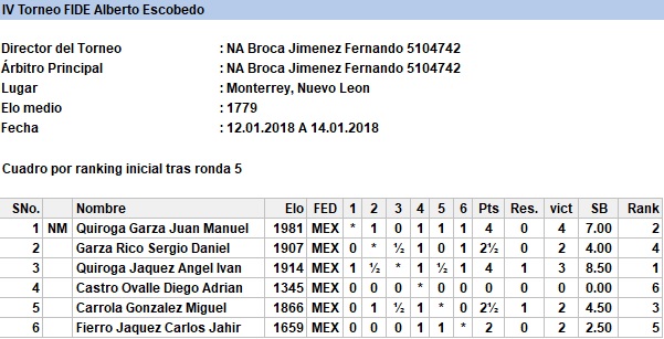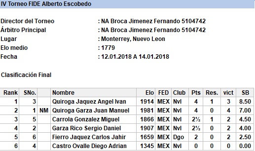 En el primer torneo válido para rating FIDE del año contamos con la participación del viejo lobo de mar, el Ingeniero Miguel Carrola González, el excampeón juvenil de Nuevo León Sergio Daniel Garza Rico, el muy joven pero ya experimentado Diego Castro Ovalle y los fuertes hermanos Juan Manuel Quiroga, Ángel Iván y Carlos Jahir, quienes durante las 5 rondas disputaron infinidad de interesantes duelos que los ayudaron a poner en práctica lo que han entrenado y se llevaron 5 fuertes partidas a un ritmo serio para analizar en casa.