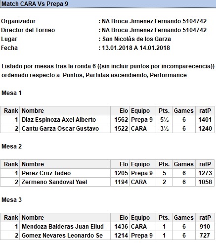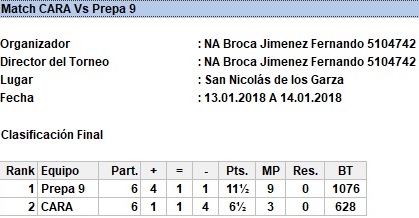 Como preparación al Estatal por Equipos de Secundaria los jóvenes del CARA se enfrentaron a un combinado de la Preparatoria 9 en un por equipos bajo sistema scheveningen, con la intención de enfrentar una dura oposición que los preparara para los más fuertes jugadores del estado. El resultado fué un duelo dominado por la Preparatoria 9 aunque en alguna de las rondas los jóvenes de secundaria se impusieron 2-1.