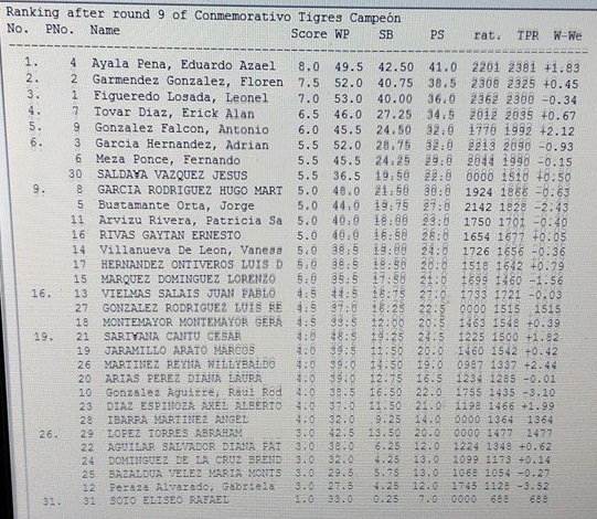 El ganador en un cierre de locura como siempre es en estos torneos fué precisamente el medallista de Bronce de la Universiada, el CM Azael Ayala quién completó 8/9 pts a medio punto del 2do lugar ocupado por el MI Florentino Garméndez González y a 1 punto del 3ro, el MF Leonel Figueredo, cabe resaltar que ningún jugador pudo evitar la derrota en este torneo.
