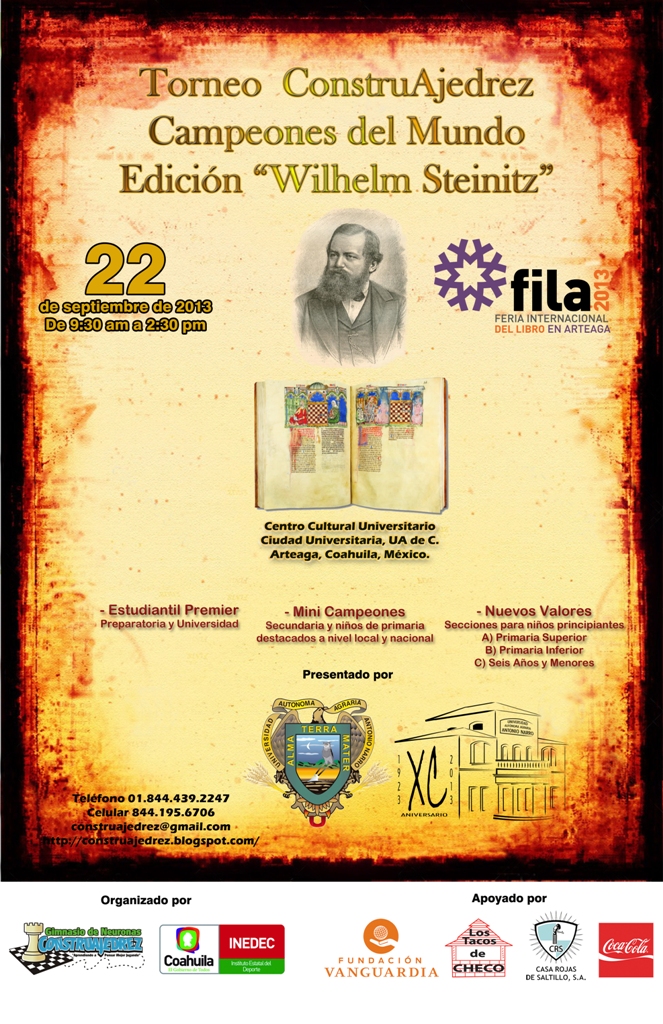 Aprovechamos la ocasión para darte a conocer que el Gimnasio de Neuronas Construajedrez instrumenta la “I Jornada de Ajedrez Para La Vida” Promoviendo el pensamiento estratégico en los niños y jóvenes a través del deporte-ciencia. Se llevara a cabo en el marco de la Feria Internacional del Libro en Arteaga FILA 2013 16va edición, es presentada por Universidad Autónoma Agraria Antonio Narro, y apoyada por el Instituto Estatal del Deporte del Estado de Coahuila, Los Tacos de Checo, Casa Rojas, Fundación Vanguardia y Coca Cola.